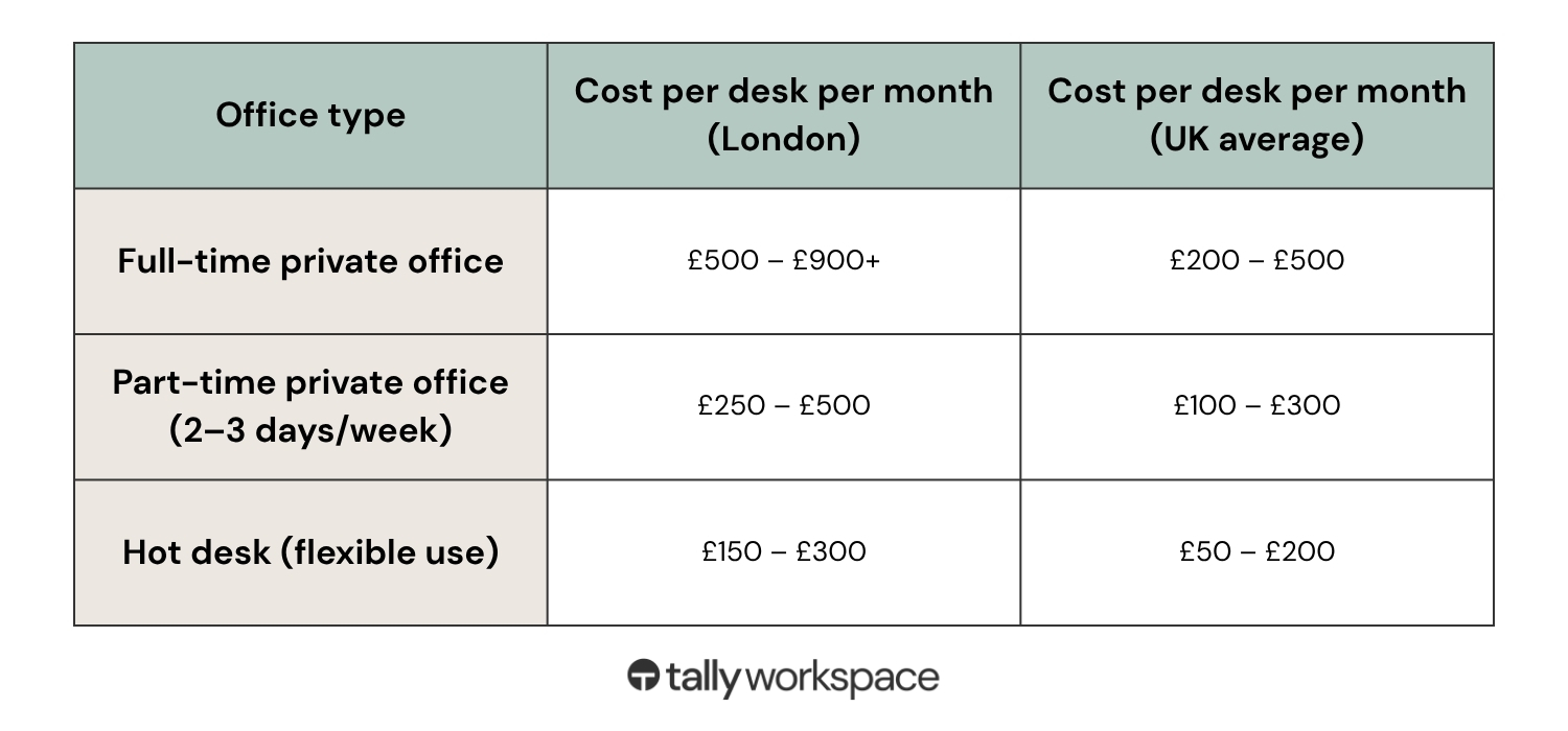 Part-time office rental costs vary widely depending on location, size, and type of office, but are generally between £100 to £500 per desk per month. Here’s a rough guide: