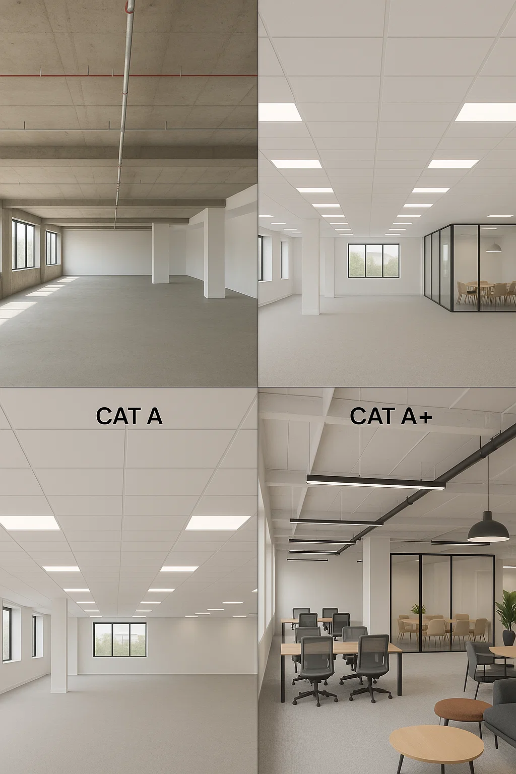 - Cat A+ bridges the gap between Cat A and Cat B – offering plug-and-play spaces with furnishings and some infrastructure in place.