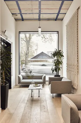 The shared office features multiple reception entrances, stylish communal lounge and kitchen, all designed in a calming natural palette – a welcoming, relaxed setting for informal meetings or collaboration.