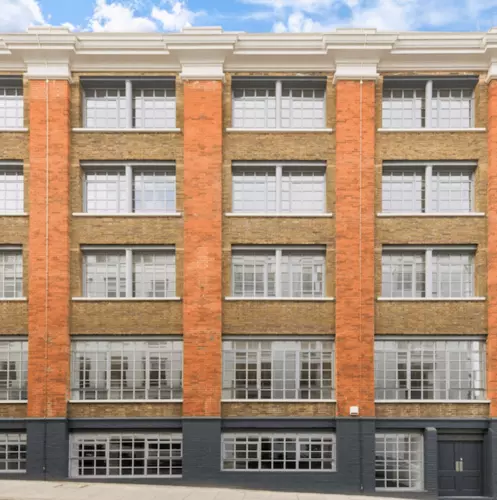 The ground level at Eyre Street Hill offers industrial-inspired spaces, currently equipped with 2-3 meeting rooms, a dedicated kitchen, and restroom facilities. Notable features include exposed steel frame beams, a striking black-painted ceiling with visible track systems, crittall-style windows, and painted exposed brickwork.