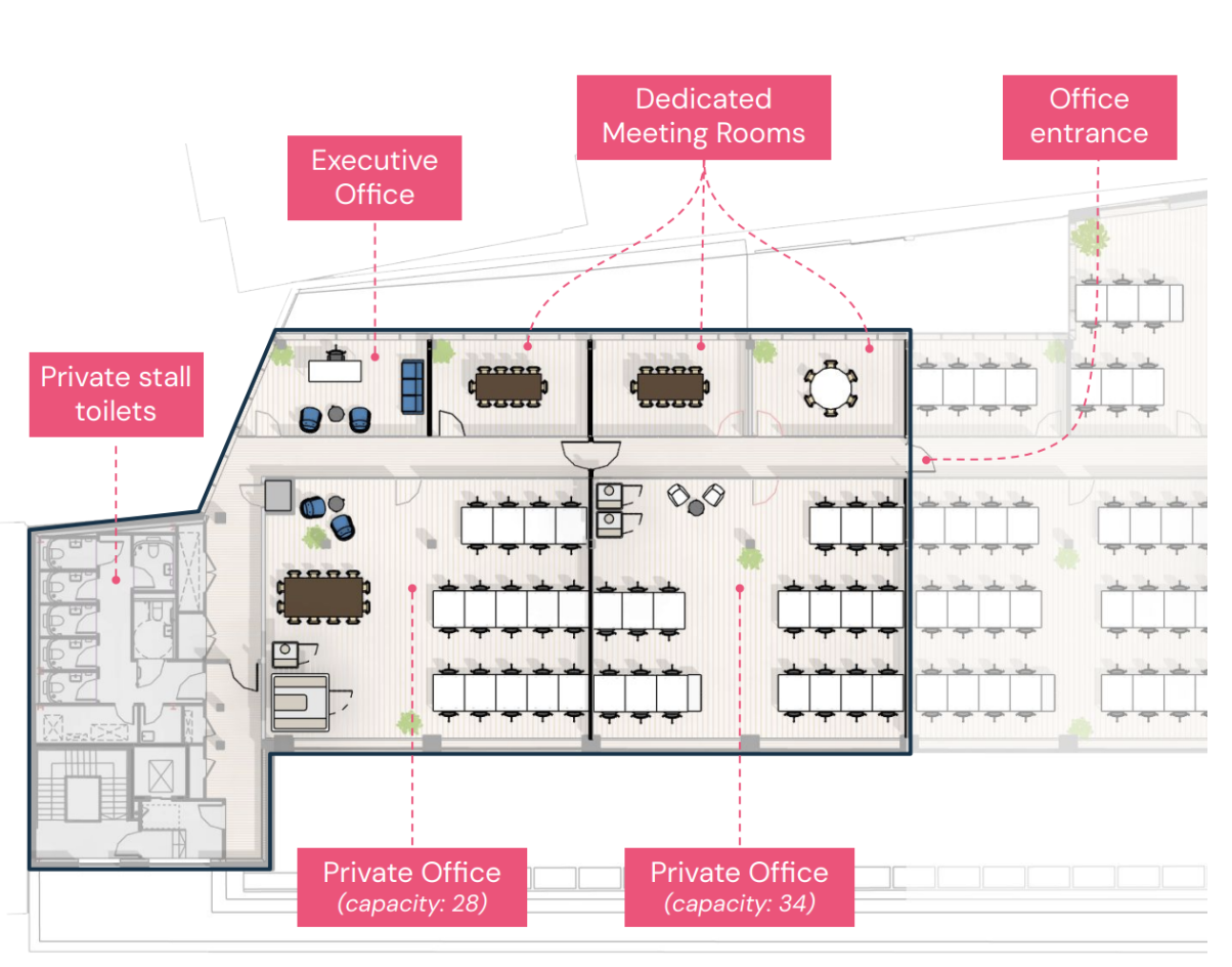 Unwind and recharge with bookable meeting rooms, on-site reception, cleaning, showers, 1 Gbps internet, breakout areas, wellness and calm room, 360 surround members' bar & cafe, secure bike storage, showers and a dog-friendly environment.
