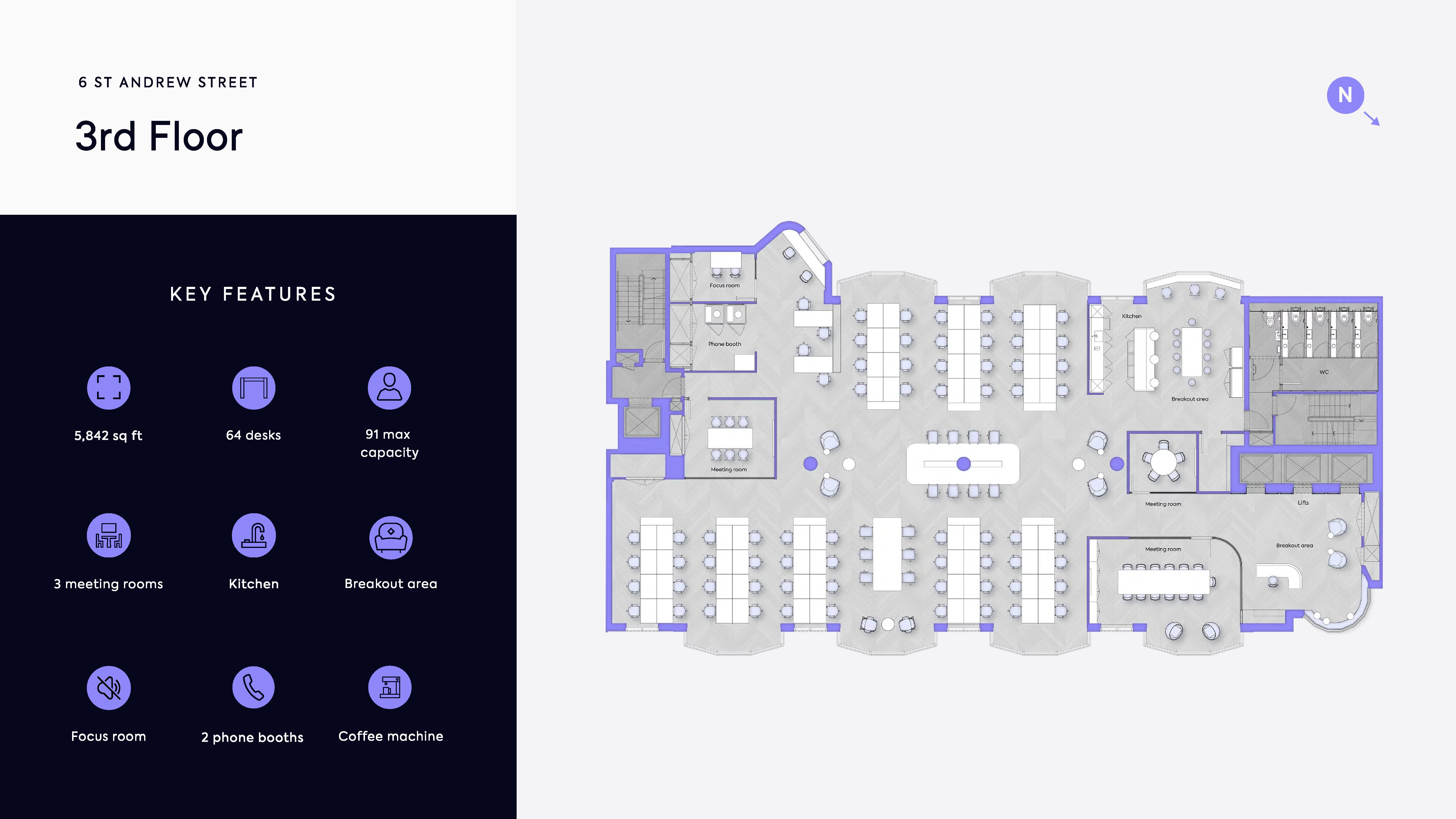 In the heart of historic Farringdon, SIX - at 6 St Andrew Street - beckons the bold and the creative. This iconic building has been revamped, featuring exceptional, fully managed workspaces. SIX offers options for teams of 14 to 91 with each floor offering exclusive amenities and thoughtfully designed common areas. Plus, enjoy the perks: a gym, showers, a rooftop terrace, and even a coffee bar! SIX delivers - incredible amenities inside and the vibrant Leather Lane market right outside your door. Take a breather in the tranquil rooftop garden, perfect for team bonding. With Farringdon, Chancery Lane, and Thameslink stations nearby, commutes are easier.