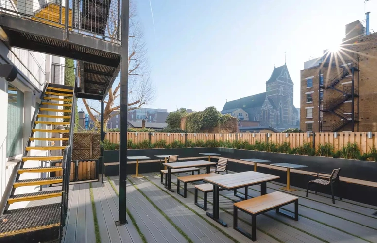 At 60 Grays Inn Road, experience minimal design in a prime central London location. The impressive meeting rooms, spacious open plan reception area, and spectacular roof terrace create a remarkable first impression. This grand industrial-style building boasts elegantly tiled monochrome flooring and matte black walls. Uniquely for central London, you can enjoy outdoor space with wooden furniture, plants, and a brilliant balcony. The communal kitchen space is perfectly designed for grabbing lunch or a coffee with colleagues. Comfortable seating areas flank the stunning entrance, featuring round tables, stools, and cushioned armchairs. In the main communal area, relax on cozy orange sofas, while the private meeting rooms offer crittal windows and curtains for added privacy.