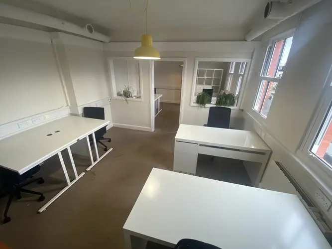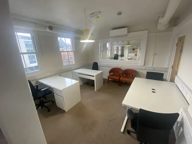 An open plan second floor office with good ceiling height, excellent natural light, shared meeting room, and a shared kitchenette