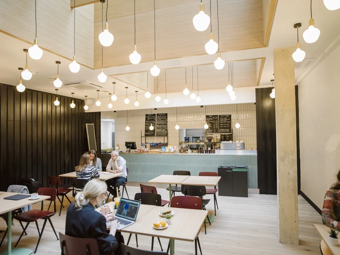 The beautifully restored interior spaces have been creatively transformed to provide a variety of modern office, studio, meeting, and breakout areas. A trendy reception area warmly welcomes you to this impressive location. Pall Mall Kitchen, a fantastic new café, offers a delectable selection of fresh and healthy breakfast and lunch options, along with coffee and tempting treats to energise your morning or afternoon. With its exposed and whitewashed brick walls and abundant greenery, this stylish space offers sage green leather seating booths with ample power outlets, as well as cozy sofas in the spacious communal area.