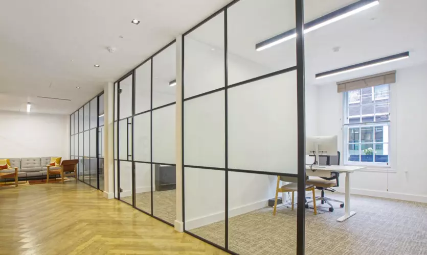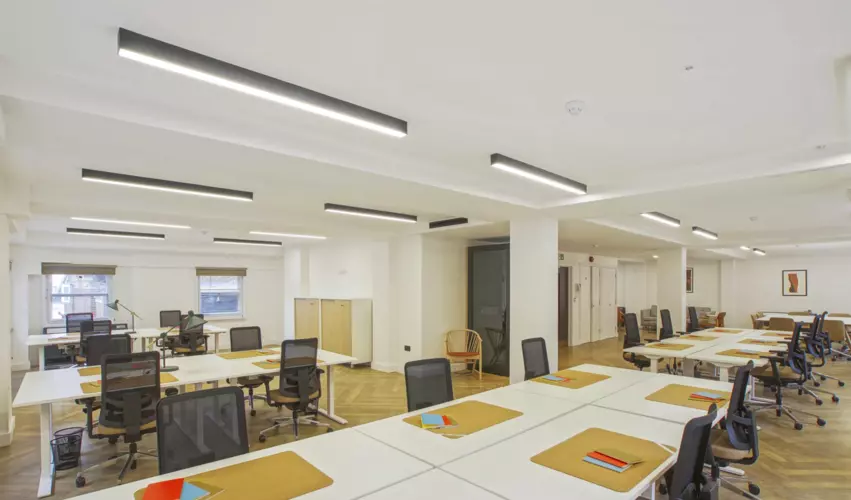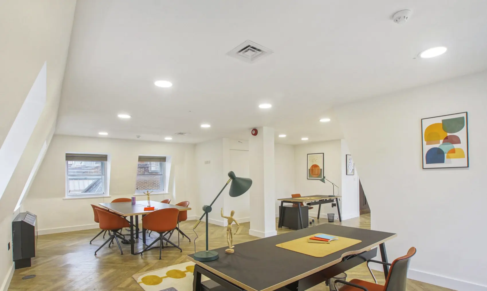 This modern, open-plan office space at, 55 Blandford Street in Marylebone, captivates with its bright and airy atmosphere, where pops of colour and abstract art add a touch of personality to the space, furnished with sleek workstations and comfortable chairs. Transport links include Bakers Street Station, Bond Street and Marble Arch, all within walking distance.