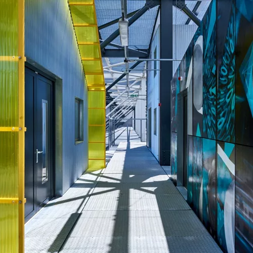 Nestled behind the 2012 Olympic Broadcast Centre, The Trampery on the Gantry reimagines a massive steel structure into a vibrant hub for creative businesses. This "joyous experiment" by Here East and Hawkins\Brown architects offers 21 affordable, light-filled studios totalling 10,000 square feet. Featuring open-plan design and easy accessibility with an elevator and lift-serviced studios and kitchen, The Trampery fosters collaboration and innovation in a unique setting.