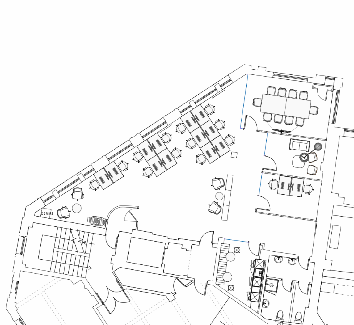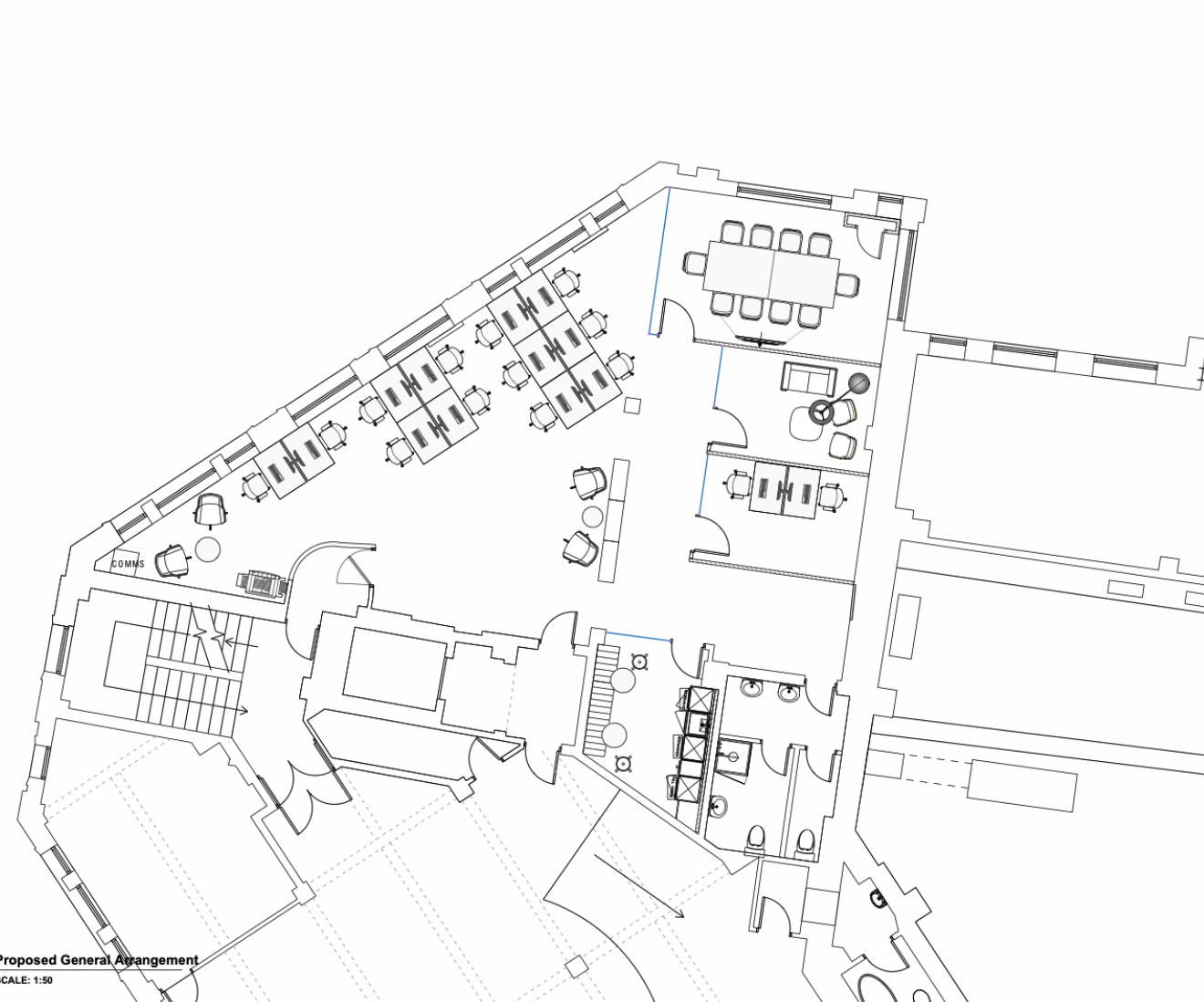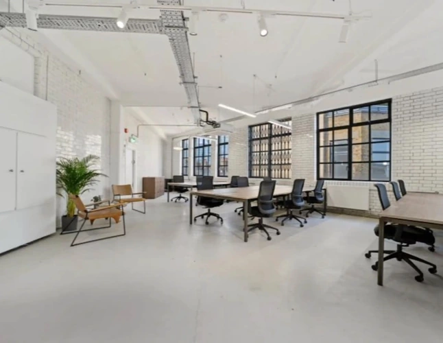 Lana House offers an elevated space within a renovated historic warehouse, featuring a remarkable office setting with a stylish industrial design. This exceptional area highlights unique original warehouse features, such as high ceilings measuring 3.7 meters, ample natural light, four meeting rooms, two private call booths, and a generously-sized rooftop terrace.