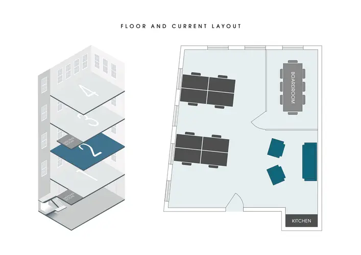 • Perfect for 8-12 desks + private 8 person meeting room or 16 desks in an open plan layout