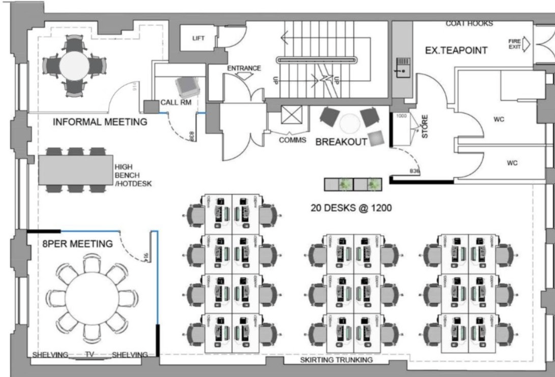 Inside, you'll find a spacious 8-person meeting room, 20 open plan desks, a private kitchen, demised shower and bathroom facilities, high ceilings, and air conditioning for your comfort. Need privacy for calls or meetings? We have private phone booths available. Additionally, enjoy a dedicated welcome area/breakout collaboration area, perfect for networking or taking a break.